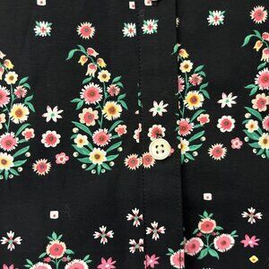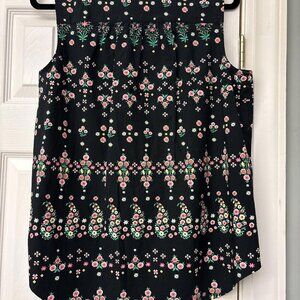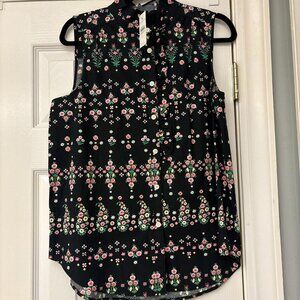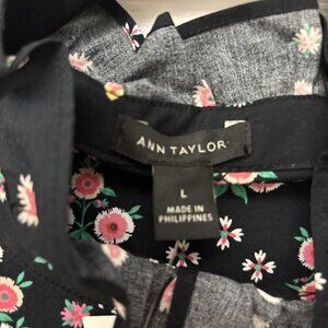 This is a new Ann Taylor women's top in size L. It features a high neckline with button closure, sleeveless design, and a black color with a floral pattern. The top has pleated and ruffle accents, giving it a boho and feminine style. Made of lightweight cotton fabric, this double-sided top is perfect for travel, parties, work, or casual wear in summer, fall, or spring. $54.99. Colorful and pretty. Perfect condition. Arm to arm: 20 inches across. Hem to shoulder: 26 inches