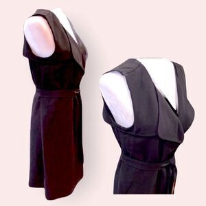 NEW with tag Ann Taylor black sleeveless dress — NWT button down front, which is off center & buttons are hidden when closed — gives it a wrap appearance — tie belt goes through side loops — classic trench details