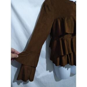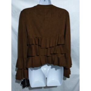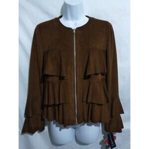 Gorgeous brand-new casual jacket from Inc international concepts by Anna Sui Night Rider in size petite medium. According to the tag is jacket retails for $129.50 and the color is sienna Brown. The style number is 7x003p-485. Also, the tag for this jacket was designed by Anna sui for the Macy's INC collection. the long sleeve jacket has a zip front closure and two wide ruffles on each sleeve as well as three down the front and the back of the jacket. The shell is polyester and spandex while the lining is 100% polyester. This jacket is super soft and the chest measurement is about 35-36 inches. The length from the shoulder to the hem is about 22 1/2 inches.