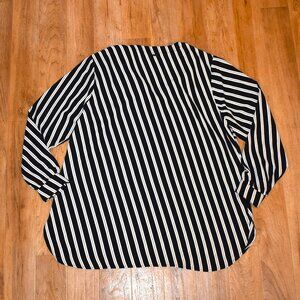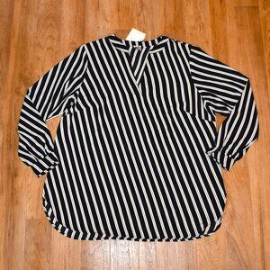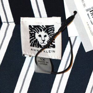New with tags long sleeve split neck (v-neck) striped blouse by Anne Klein. Size 1X and 100% polyester. Color: Anne Black/Zinc Combo. Features diagonal stripe pattern thoughout in black/off white. Neckline is split (v-neck). Comes from a smoke free home.