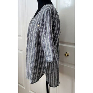 NWT Anne Klein Women's White Gray Linen Tunic 1/4 Zip Roll Tab Sleeve Top Sz M