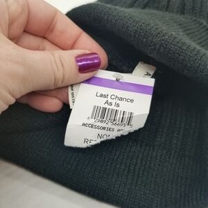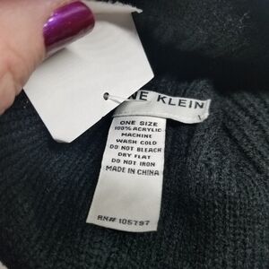 Ribbed black knit hat with a large pom pom on the top. Front of hat has the Anne Klein lion logo in silver colored rhinestones. See photos for fabric and care details.