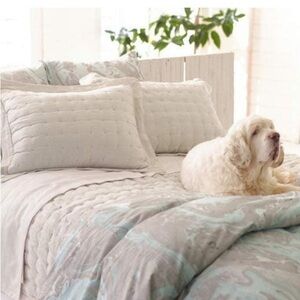 These new in package pair of Annie Selke Brussels Qulited standard pillow shams in tonal natural feature a herringbone design. Made of a soft linen viscose blend. Made in India. A perfect neutral. Tie back envelop entry. 2.5 inch flange on edging. Hand quilted. New!