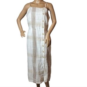 NWT Anthopologie Mo:vint Linen Beige Plaid Sleeveless Button Midi Dress Medium