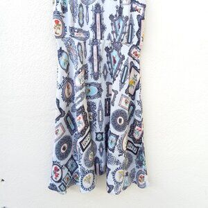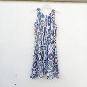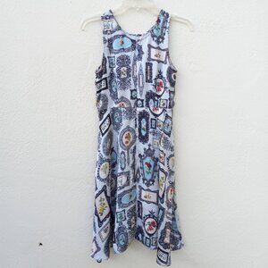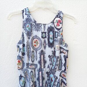 Very very light blue - almost white- dress with allover ornate antique framed flower print reminiscent of a photo/picture wall. Sleeveless. Lightweight viscose fabric. Partial zip back. New with tags attached. Wear to a party or dress down with tights and doc martin boots, keds/converse, or ballet flats.