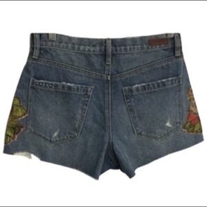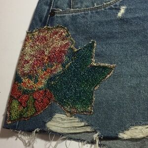 High-rise denim shorts flaunt embroidered floral patches.