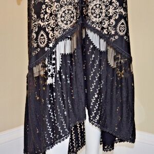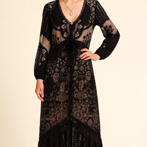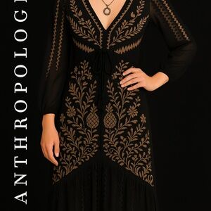 Keywords: Anthropologie embroidered maxi dress, black V-neck dress, bohemian chic, long sleeve party dress, festival style, cocktail resort wear black embroidery