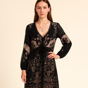 Chic and versatile, this Anthropologie maxi dress is designed with intricate black embroidery, a flattering V-neckline, and full-length sheer sleeves. Crafted for effortless elegance, it can be styled for cocktail parties, vacations, or casual-chic daytime looks.