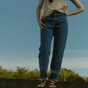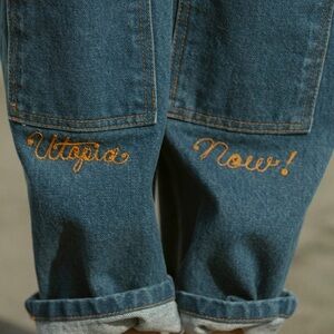 A beloved classic in our pants arsenal, this version of our Monochrome Carpenter Jeans feature a medium wash and gold stitching throughout. Straight-leg style with reinforced front patches are a high-rise fit that are both sturdy and soft for everyday wear. They are constructed of 100% cotton denim and have been pre-washed. Choose embroidered (Utopia Now!, as pictured) or get them plain!