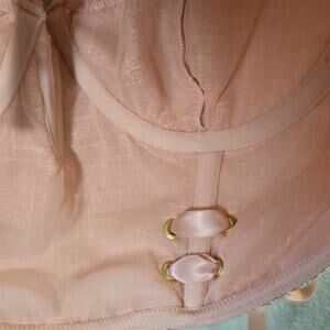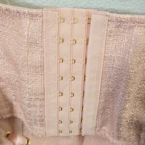 Anthropologie blush corset top with soft structure and sheer boning edge, size Small. This piece blends that soft structure with a fitted bodice, molded cups, and delicate ribbon lacing down the back for a clean romanticcore finish. The hook closure and cropped cut make it perfect for layered looks or worn solo with attitude. Lightweight but lined, it gives sexy meets casual with a nod to vintage lingerie styling—quietly bold but completely wearable.
