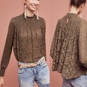 NWT Anthropologie Deletta Moss Vintage Lace Mock Neck Blouse Olive Green Small