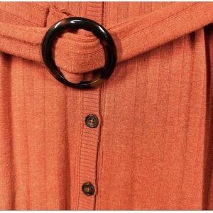 Elevate your wardrobe with this stunning Anthropologie Elsa sweater midi dress in a vibrant orange color. The dress features a button-up front with ribbed texture and flared bell sleeves, adding a touch of elegance to the outfit. The dress falls mid-length and is perfect for any occasion, whether it's a formal event or a casual outing.