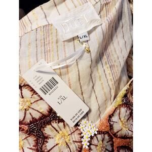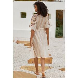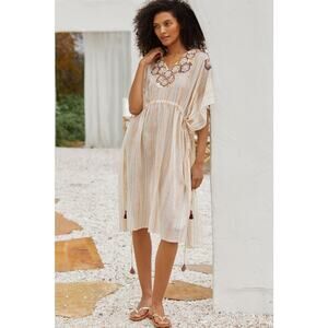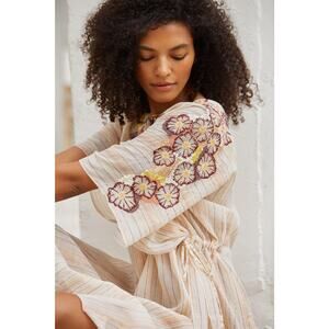 This beautiful Anthropologie L/XL Duet Embroidered Kaftan is the perfect summer essential or for a vacation getaway. It features a cotton pullover styling with floral embroidery, beading, sequins and stripes in soft color hues.