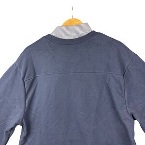 This unique Anthropologie En Elly OVERSIZED layered sweatshirt dress combines casual and preppy vibes in one effortless piece. Featuring a navy crewneck sweatshirt with bold NEW YORK lettering across the chest, paired with a contrasting blue-and-white striped shirttail hem and collar for a chic layered look. Perfect for easy styling with sneakers, boots, or loafers.