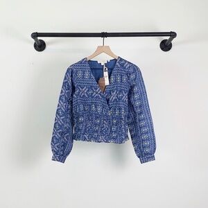NWT Anthropologie Forever That Girl Embroidered Smocked Long Sleeve Blouse Blue