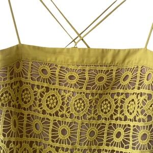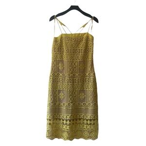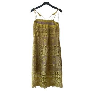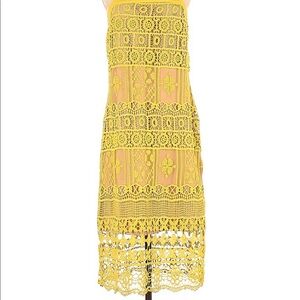 NWT! Anthropologie Greylin Shilla lace woven dress in citron. Beautiful crochet lace overlay with a nude slip. Midi length. Scalloped hemline. Sleeveless.