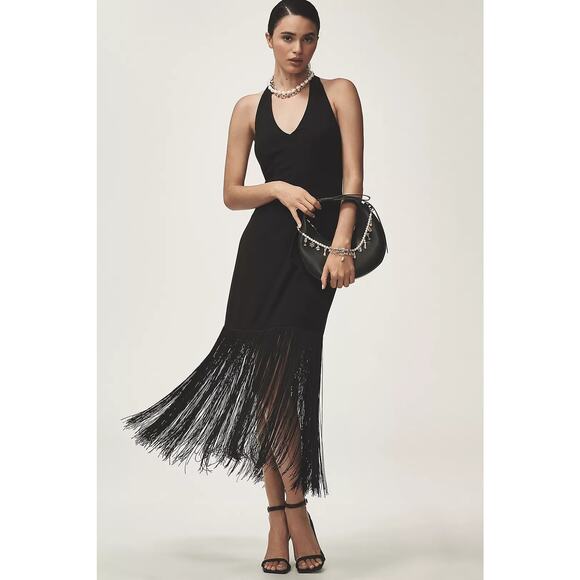 NWT Anthropologie Hutch Plunge Halter Fringe Knit Midi Dress $248 XS Black