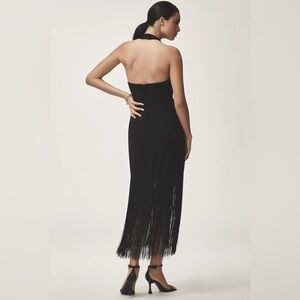 Turn heads in this stunning Hutch by Anthropologie midi dress, brand new with tags. Designed with a plunging halter neckline and a dramatic fringe hem, this dress brings the perfect mix of sophistication and playful movement. Its flattering knit fabric gently skims the body, offering comfort and structure - ideal for dancing the night away.