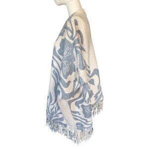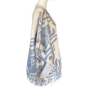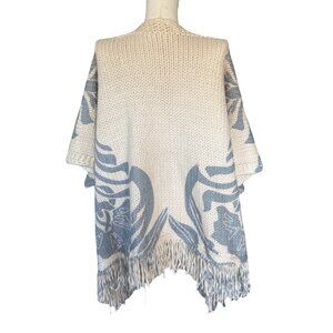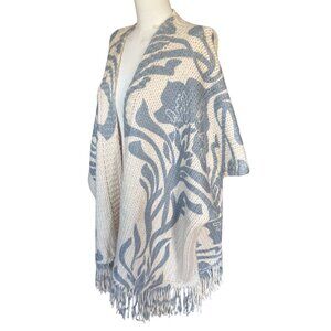 NWT Anthropologie Ivory Blue Floral Chunky Knit Fringe Shawl Poncho One Size