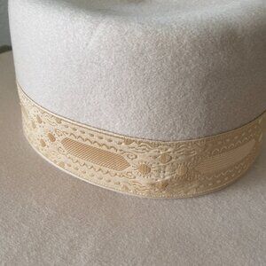 Classic boater style wide-brimmed hat featured in a structured design with an embroidered ribbon around the crown.