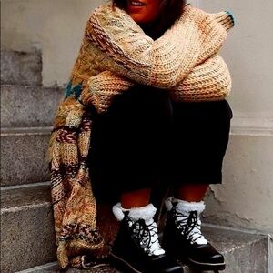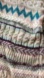In the last stock photo before the detail information photo is a blowup showing the loose purple yarns -that is how the sweater is made with purple threads having loose ends