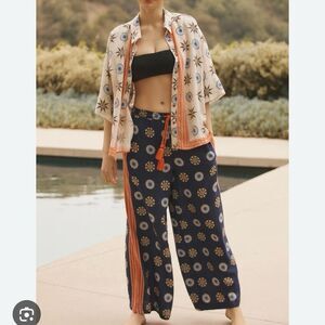 New with tags Anthropologie linen set in navy, orange and cream print. Wide leg drawstring pants with pockets and button down top. Size XS. Oversized fit.