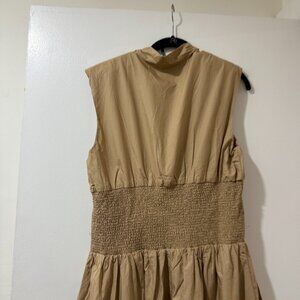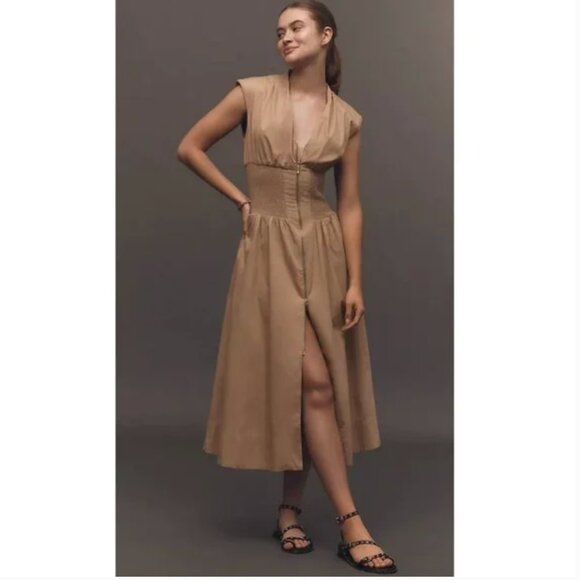 Make a statement in this effortlessly chic Maeve by Anthropologie midi dress. Designed in a timeless neutral tan hue with a flattering smocked waist and front zip detail, this piece is equal parts polished and relaxed — perfect for brunch, vacations, or everyday elevated wear 🌞✨