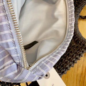 A super cute straw bag, with a separate removable striped zip liner bag. Liner is blue and white stripes w/shiny gold zipper.