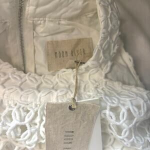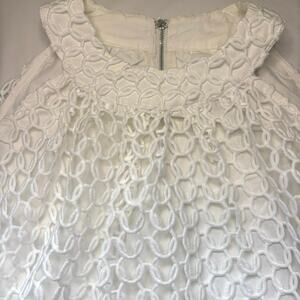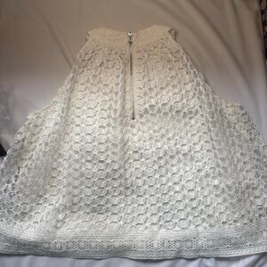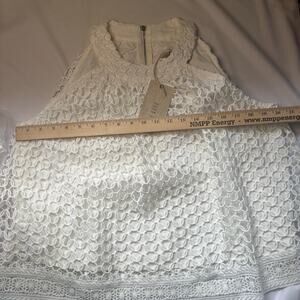 Add a touch of timeless elegance to your wardrobe with this stunning New With Tags Anthropologie Moon River sleeveless top. Featuring a beautifully textured white lace overlay and delicate floral trim along the hem, this top is perfect for both casual and dressy occasions.