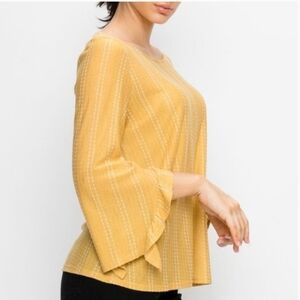 Chic and versatile, this W5 (Anthropologie) mustard yellow blouse is the perfect mix of casual and dressy. Featuring subtle white vertical dotted stripes, feminine ruffle-accented bell sleeves, and a relaxed fit, this blouse can easily transition from work to weekend. The lightweight woven fabric makes it comfortable to wear year round.