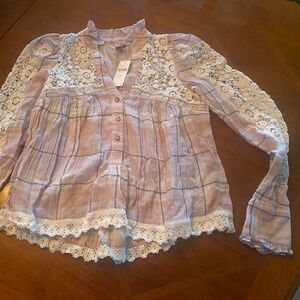 NWT Anthropologie PILCRO Purple Lavender Haze Plaid Crochet Sleeves Blouse