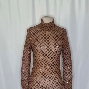 High mock or turtleneck neckline ~ Long sleeves ~ Straight hemline ~ Pullover styling … no closures ~ Fabric is an unlined semi-sheer mesh … may need something underneath ~ Bronze brown color … covered with diagonal rows of metallic sequin embellishments