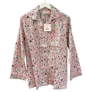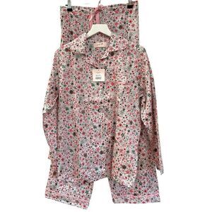 Get cozy in this Anthropologie Papinelle Christmas pajama set, perfect for the holiday season. The set includes a long-sleeved top and matching bottoms, both in a berry pink color with stars in the design. The top has a collared neckline and a drawstring closure, while the bottoms have a casual sleeve and a button accent.