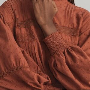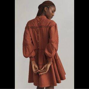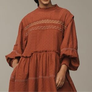 NWT Pilcro Anthropologie long sleeve mock neck mini dress in rust size medium. Button up back, pleats, lace details, and raw hem.