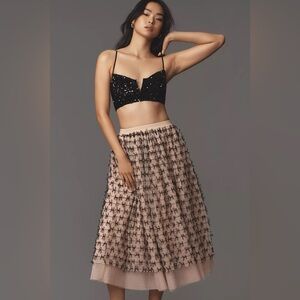 This Anthropologie skirt in a charming pink hue is perfect for cocktail events or a night out. The midi-length A-line design features exquisite embellishments and tiered layers, adding a touch of elegance and flair. Its flowy silhouette and delicate details make it a standout piece for any special occasion.