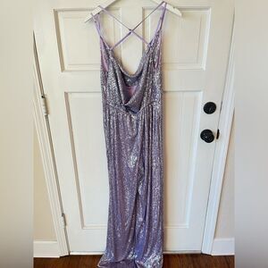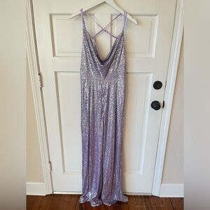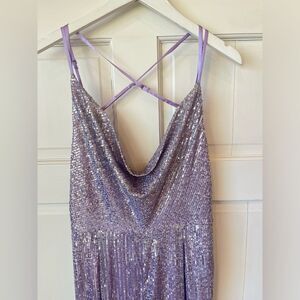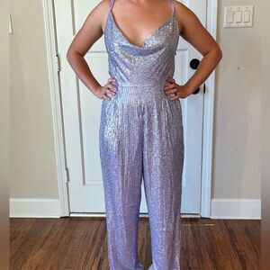 Gorgeous stunning jumpsuit in lavender sequin. Pair with a fun coat, belted and under sleeves!