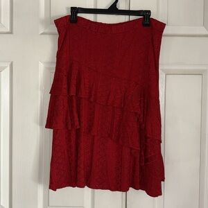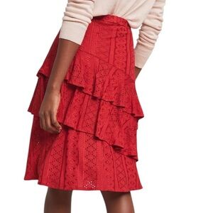 NWT Anthropologie red angled tiered eyelet knit pull on skirt. Size S. Measures larger. 16 3/4” waist across laid flat. 24” waist to hem. Please see all photos for description.