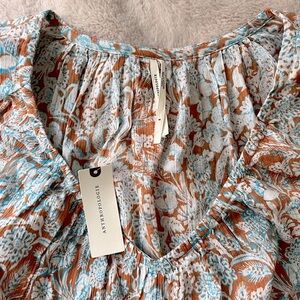 NWT Anthropologie Ruched Floral Cropped Oversized Top Brown Blue Motif Size S