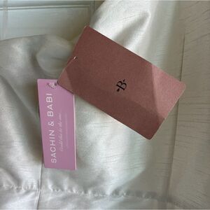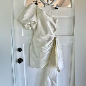 Sold out on Anthro. There are statements, and then there's the Sachin & Babi Dova Dress: a jaw-dropping mini that is quite literally wrapped with a bow. A new and improved longer version of our Dorien silhouette, it boasts a puffed one-shoulder neckline, ruching at the side of the waist, and a dramatic side train.