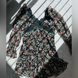 Beautiful chiffon dress with lace insert on the bust, floral chiffon pattern, sheer sleeves , ruffle details