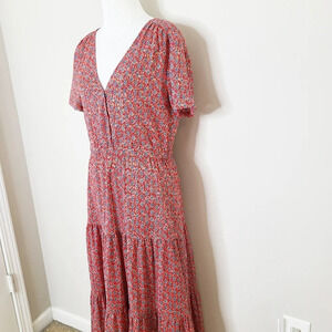 New with Tags Anthropologie See U Soon short sleeve red tiered dress. Red with beautiful boho print and metallic threading throughout. V-neckline that fastens at front. V-back. Elasticized waistline for a flattering fit.