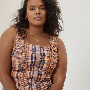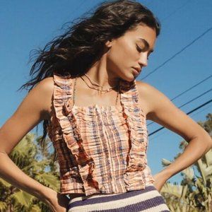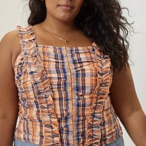 NWT Verb by Pallavi Singhee ruffled tank top from Anthropologie. Orange & blue plaid. Hook and eye closure in the front. Ruching in the back, giving the top an elastic stretch. Lined in the front. Women's size large.