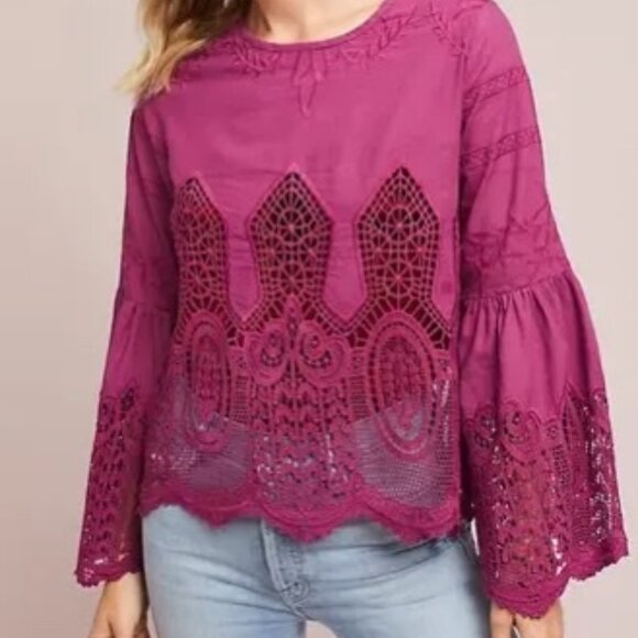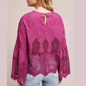 NWT Anthropologie by Chloe Oliver Women's Purple Bell-Sleeve Lace Blouse Size XS