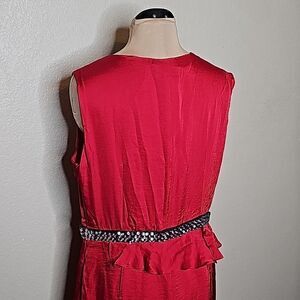NWT Antonio Melani 12 Red Satin Claudette cocktail dress with beaded waist in excellent new condition . peplum detail, sleeveless, side zip, ruffle v neck, lined