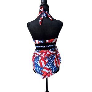 Red white and blue American flag print bikini two piece. High waist bottom with twist detail front. Tie neck 2 strap back closure. Removable padding.
