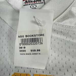 The product is a NWT Appalachian State Mesh Football Jersey in white, featuring the number 99. This officially licensed jersey by Alleson Athletic is designed for youth players in size large. Representing the Appalachian State Mountaineers, this jersey is perfect for young boys looking to show their team spirit during the regular season games. Made in Madagascar, this jersey is a must-have for young football fans looking to support their favorite college team on and off the field.