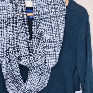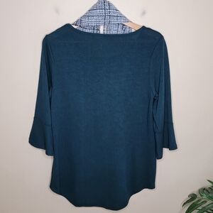 Beautiful dark teal green 3/4 bell sleeve top with coordinating black & white infinity scarf. Scarf is not attached to the top.