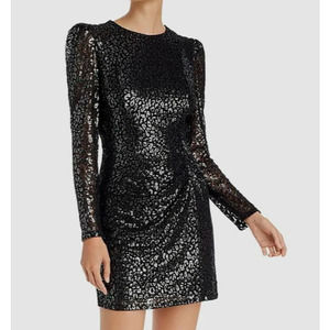 • Features: Round neck, structured puffed long sleeves, elasticized waist, draped ruched detail at skirt, concealed back zip with hook-and-eye closure, sheath silhouette, mesh body with metallic flocked leopard pattern, lined at body, fitted through bust, waist and hips, slightly stretchy fabric, designed for a mini length