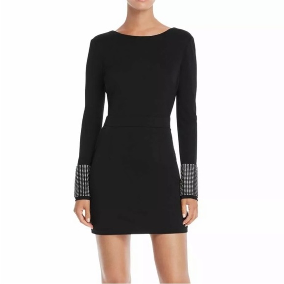 NWT Aqua Luxe black mini cocktail dress long sleeve v back zip lined rhinestone embellished cuff sleeve small s