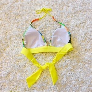 BRAND NEW! Aqua, Orange & Yellow Sexy Abstract Halter Top Bikini! All tags and safety liner are attached. Size: Small, will fit XS-S. Top will fit A/B cup US bra size. Top has removal padding and creates nice cleavage. Bottoms are low-rise cheeky style. Bottom measures approximately 8โ rise and 28โ around the waist laying flat without stretch. This swimsuit has some stretch to it and the fabric is thick and very good quality. Stand out from the crowd on your next beach vacation! ๐ดโ๏ธ๐๐
